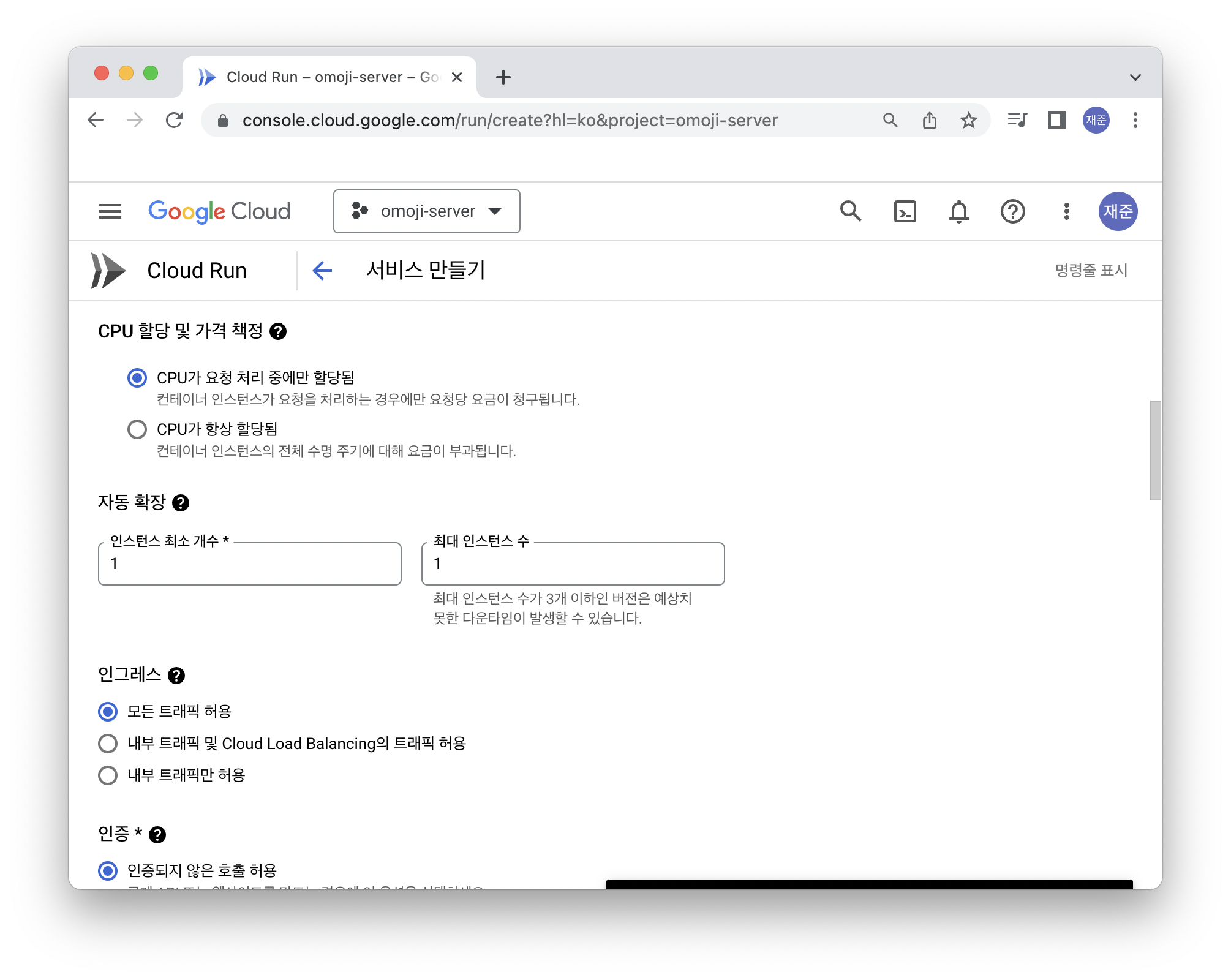 추가적으로 인그레스와 이증의 경우 백엔드 서버를 운용 중이기 때문에 "모든 트래픽 허용"하고 인증 또한 "인증되지 않은 호출 허용"으로 선택하였다.