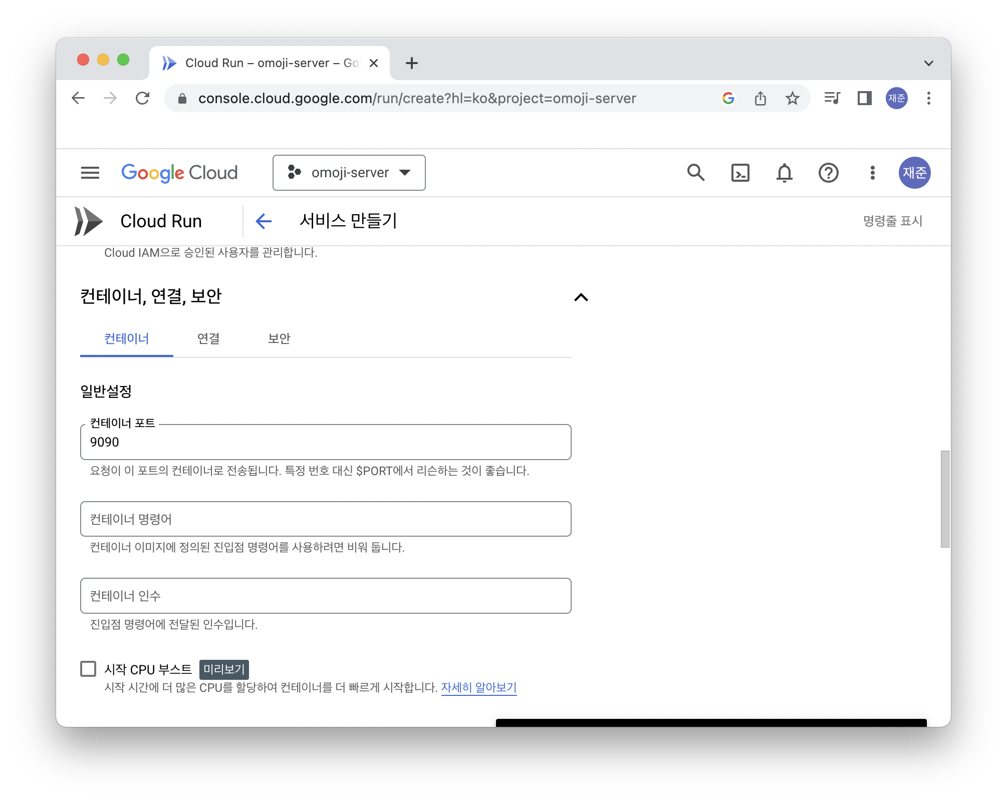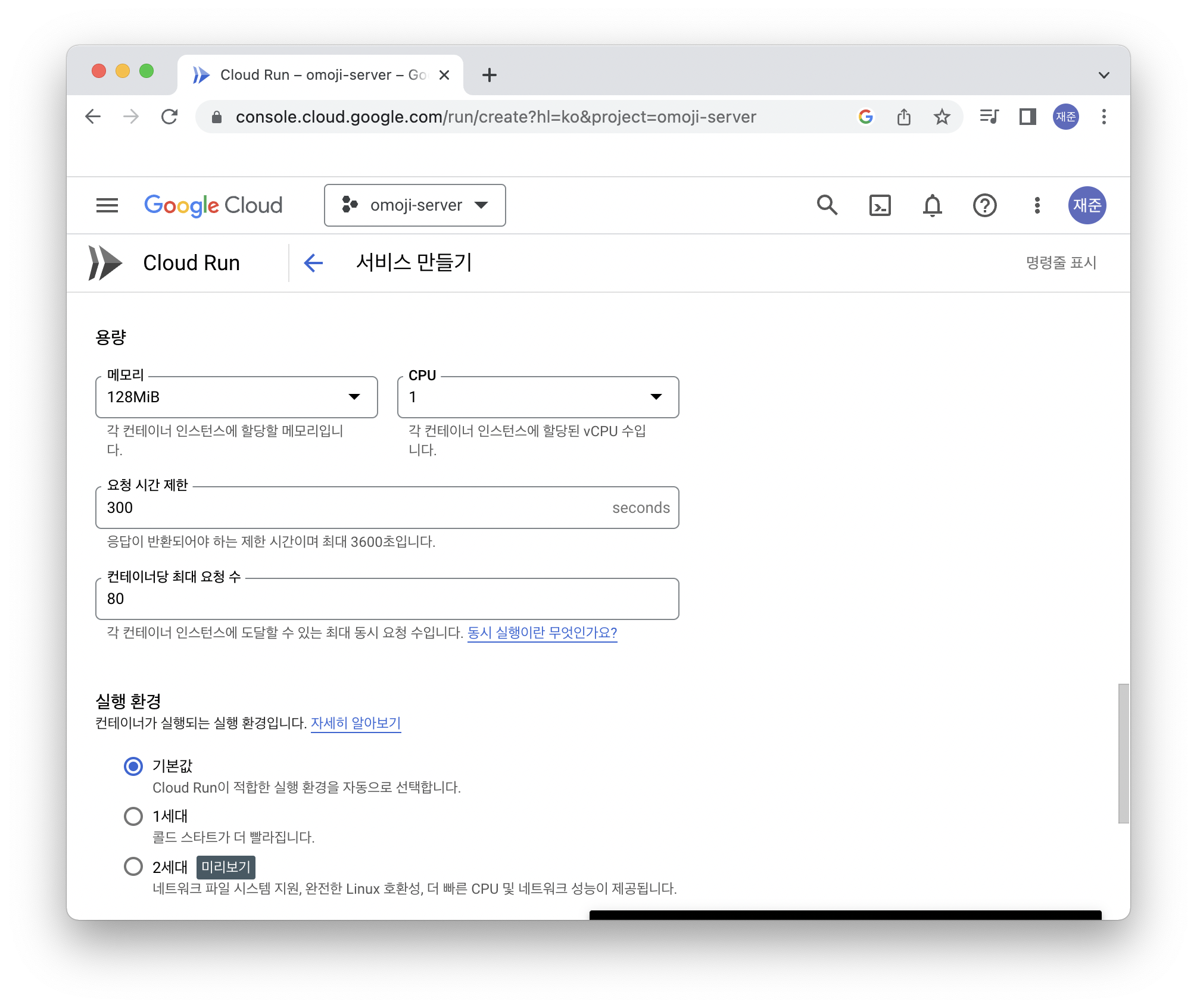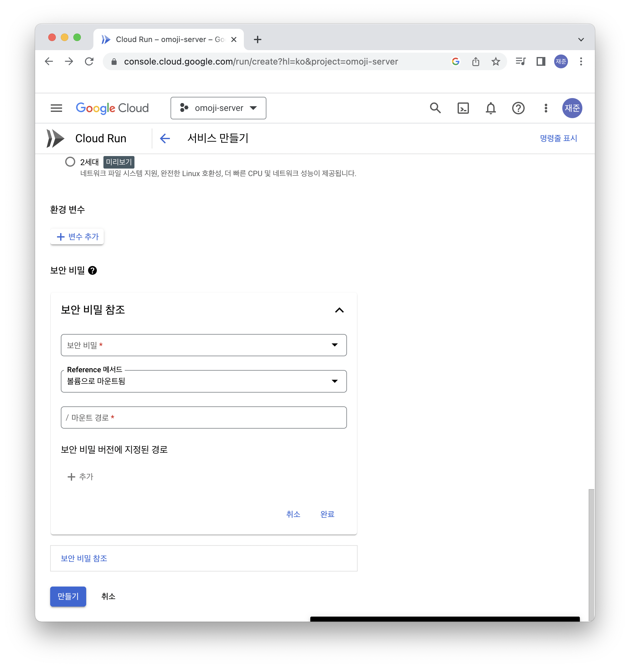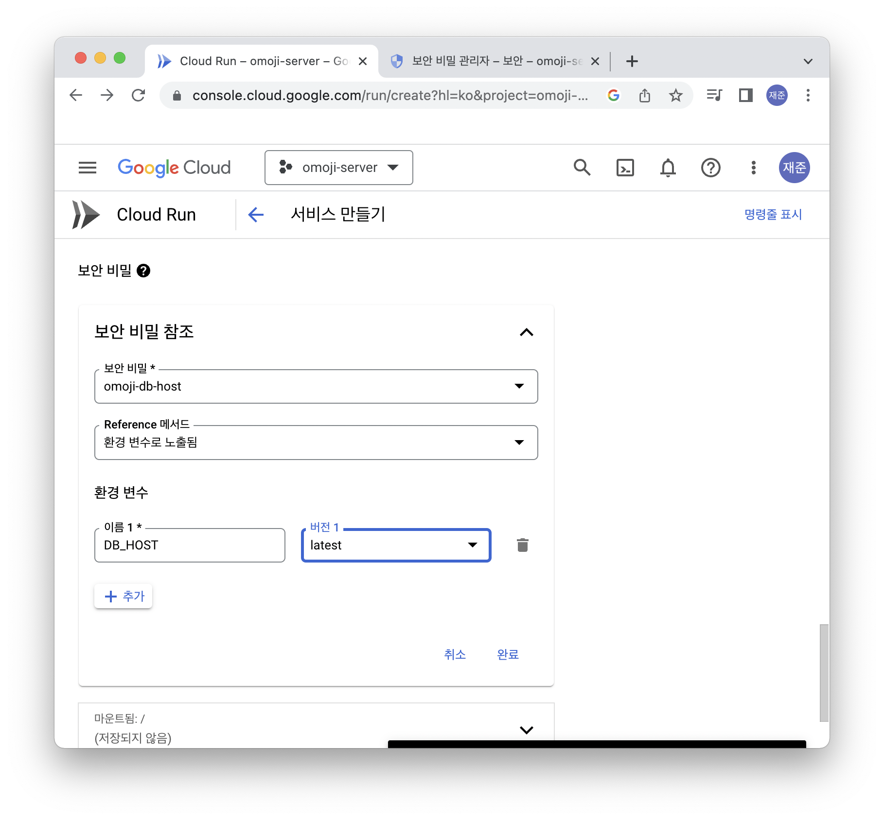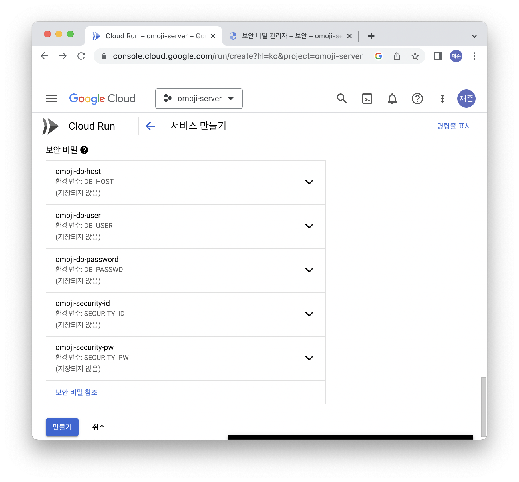 이후 Cloud run으로 돌아와 생성한 비밀코드를 환경변 수로 사용할 수 있도록 등록해주어야한다.