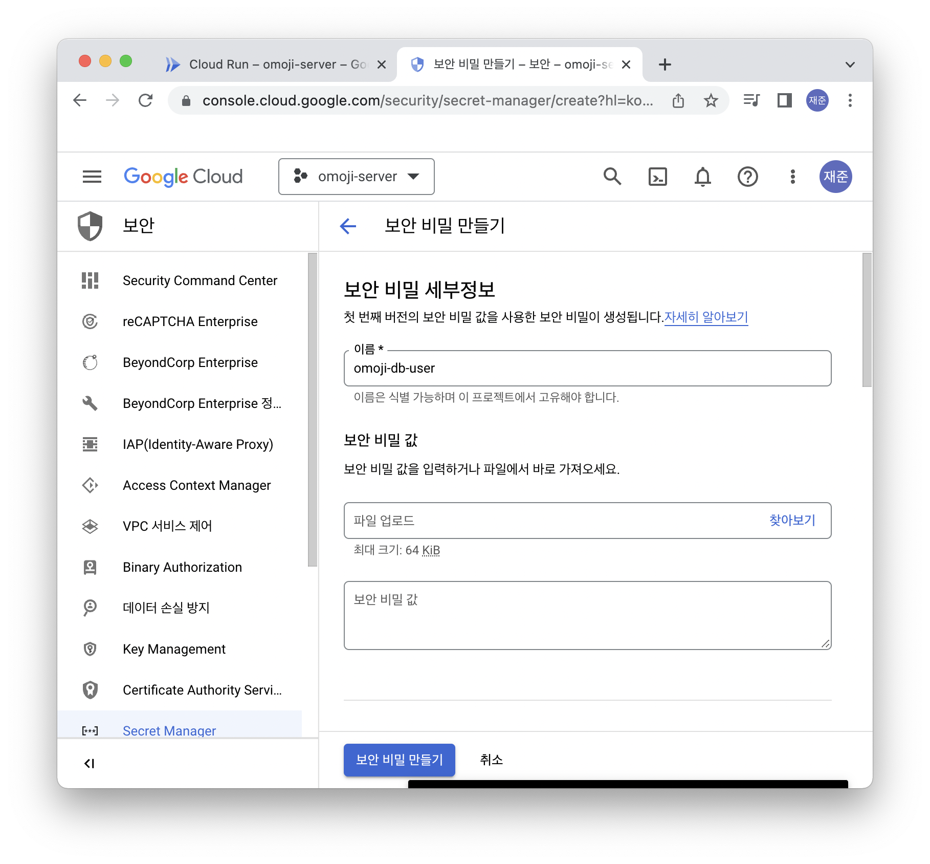 이전에 Secret Manager로 이동하여 Secret Manager를 활성화 시키고 값을 생성한다.