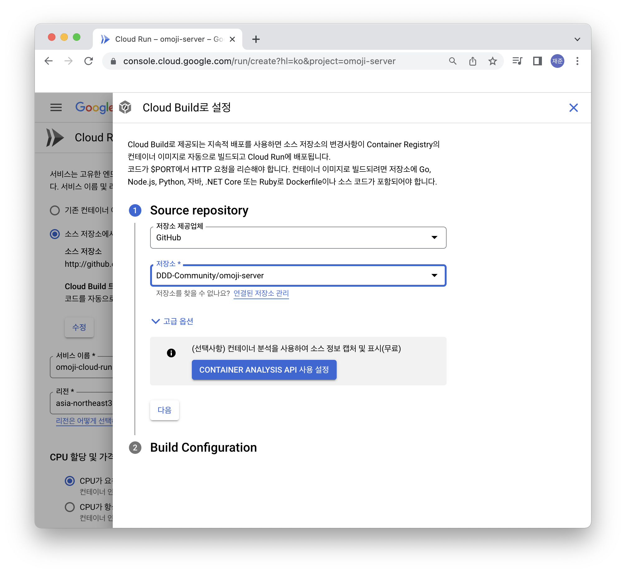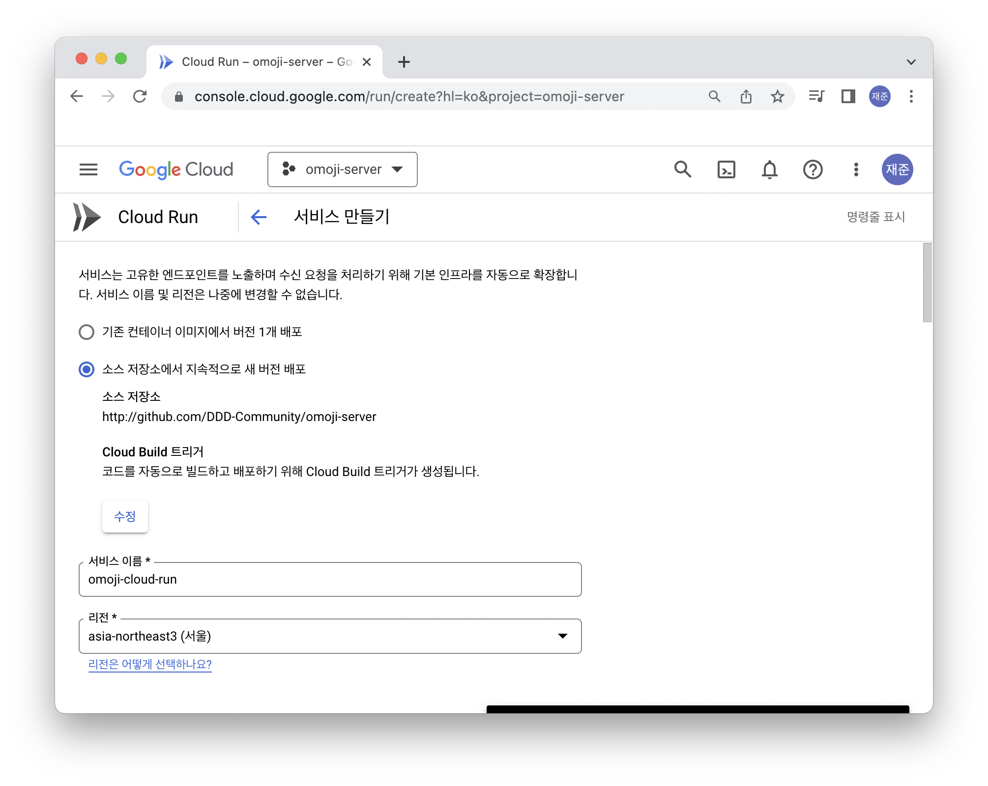 변동사항이 생길때 마다 특정 트리거에 의해 서비스가 컨테이너가 새롭게 실행되게 하려면 "소스 저장소에서 지속적으로 새 버전 배포"를 선택한다. 이를 선택할 경우 Cloud Build와 연동하여 버전 업데이트시 자동으로 컨테이너가 새로운 버전으로 교체된다.