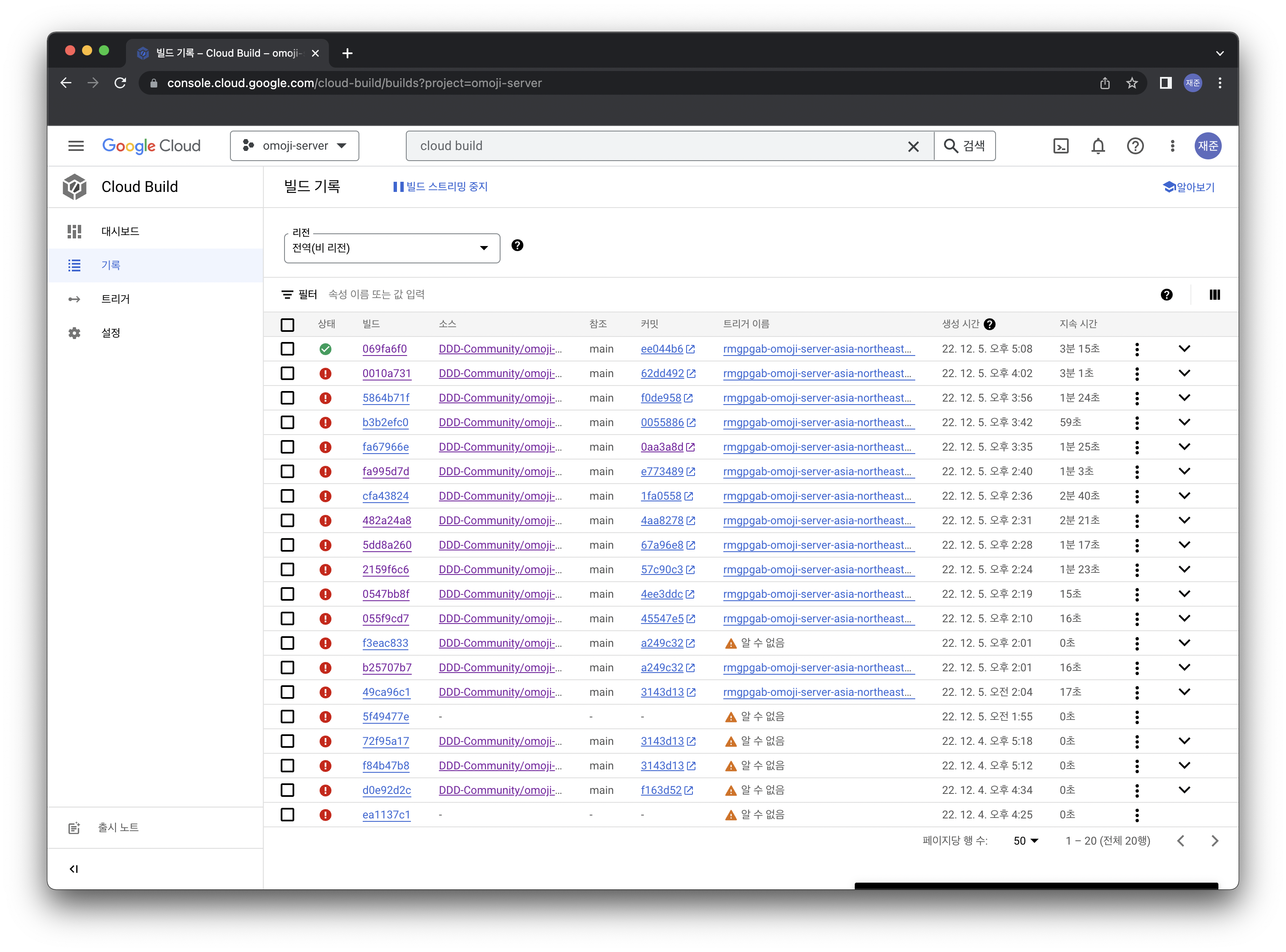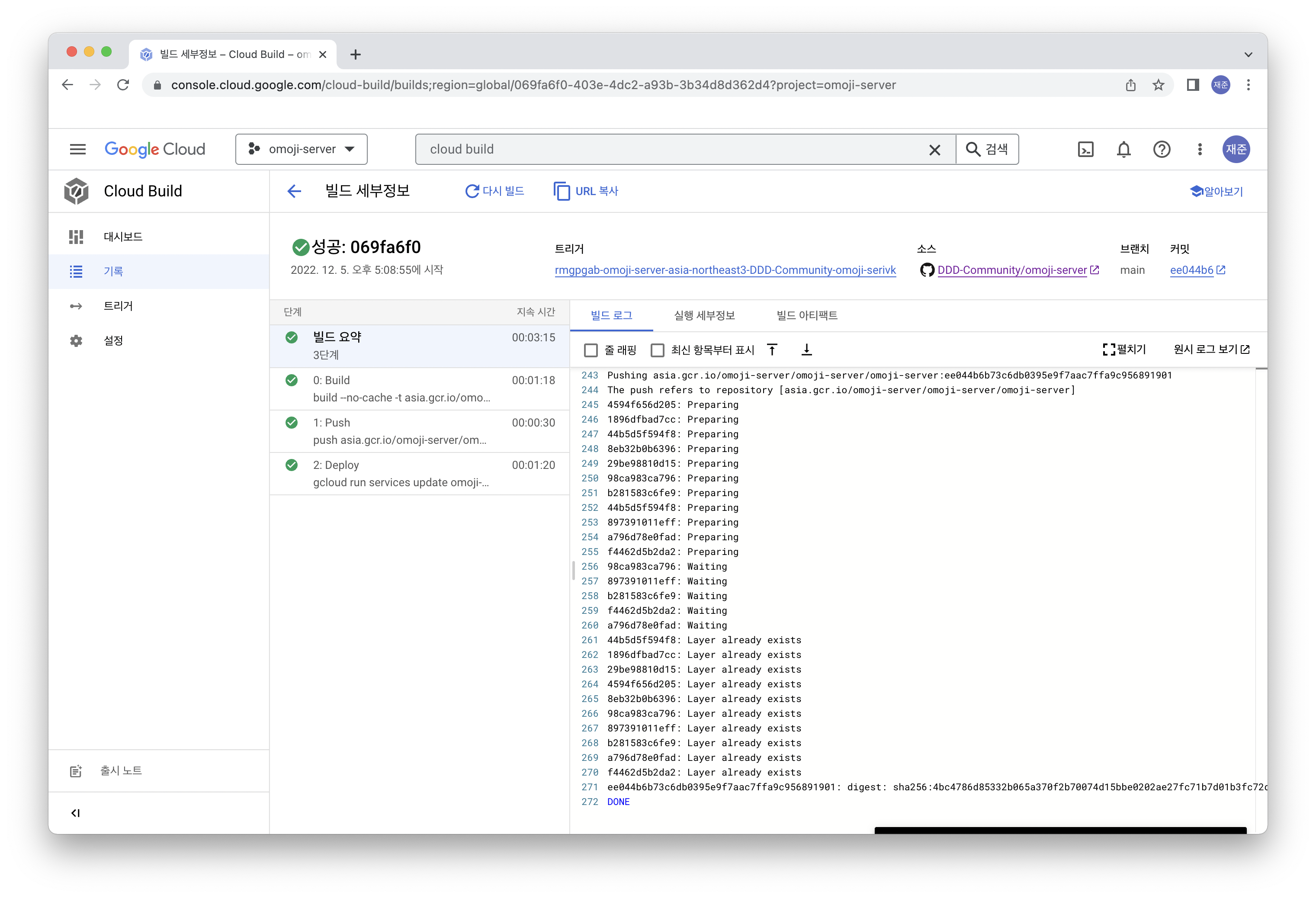 설정을 완료하고 빌드를 시작하면 위 사진 처럼 빌드 성공 여부를 Cloud Build 기록에서 확인할 수 있다.