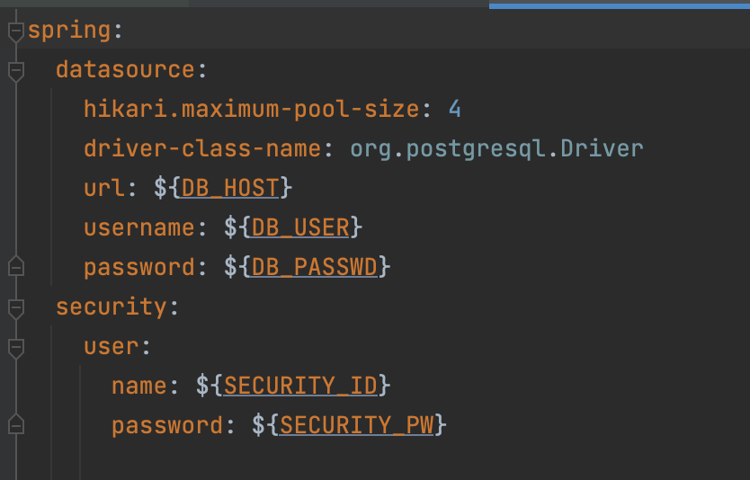 글 최상단에 나와있는 application-prod.yml을 보면 ${DB_PASSWD}와 같이 값이 적혀있는데 이는 시스템의 환경 변수중 DB_PASSWD라고 지정되어있는 값을 불러오는 것이다.