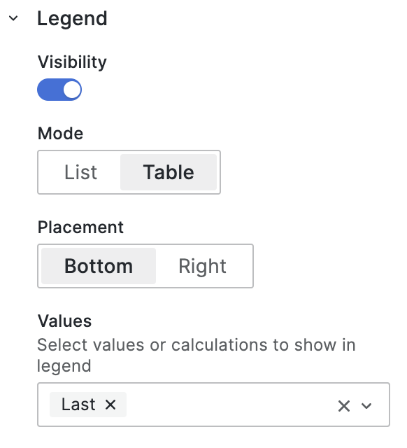 Legend를 Mode를 List와 Table중 한가지를 선택할 수 있다. 추가적으로 위 사진의 Last와 같이 Values를 설정하면 특정 Legend의 정보를 함께 추가할 수 있다. 예를들어 Last, Min, Max, Range 등 이 있다.
