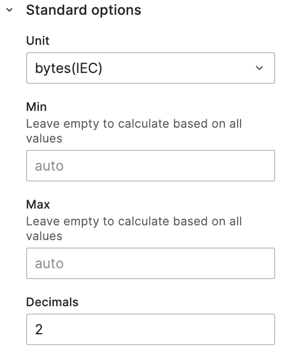 데이터의 단위를 명확하게 정의하면 해당 단위에 맞게 표기형식을 변경해준다. 예를들어 데이터의 기본 단위가 bytes로 이뤄져 있다면 오른쪽 설정 중 Standard options의 Unit을 변경하면 된다. 예를들어 파일 용량을 담은 데이터가 있고 값의 기본 단위가 bytes면 Unit을 bytes로 변경해보자. 숫자 형식에 따라 Byte, KB, MB, GB 와 같이 형식에 맞게 값을 변경해준다.