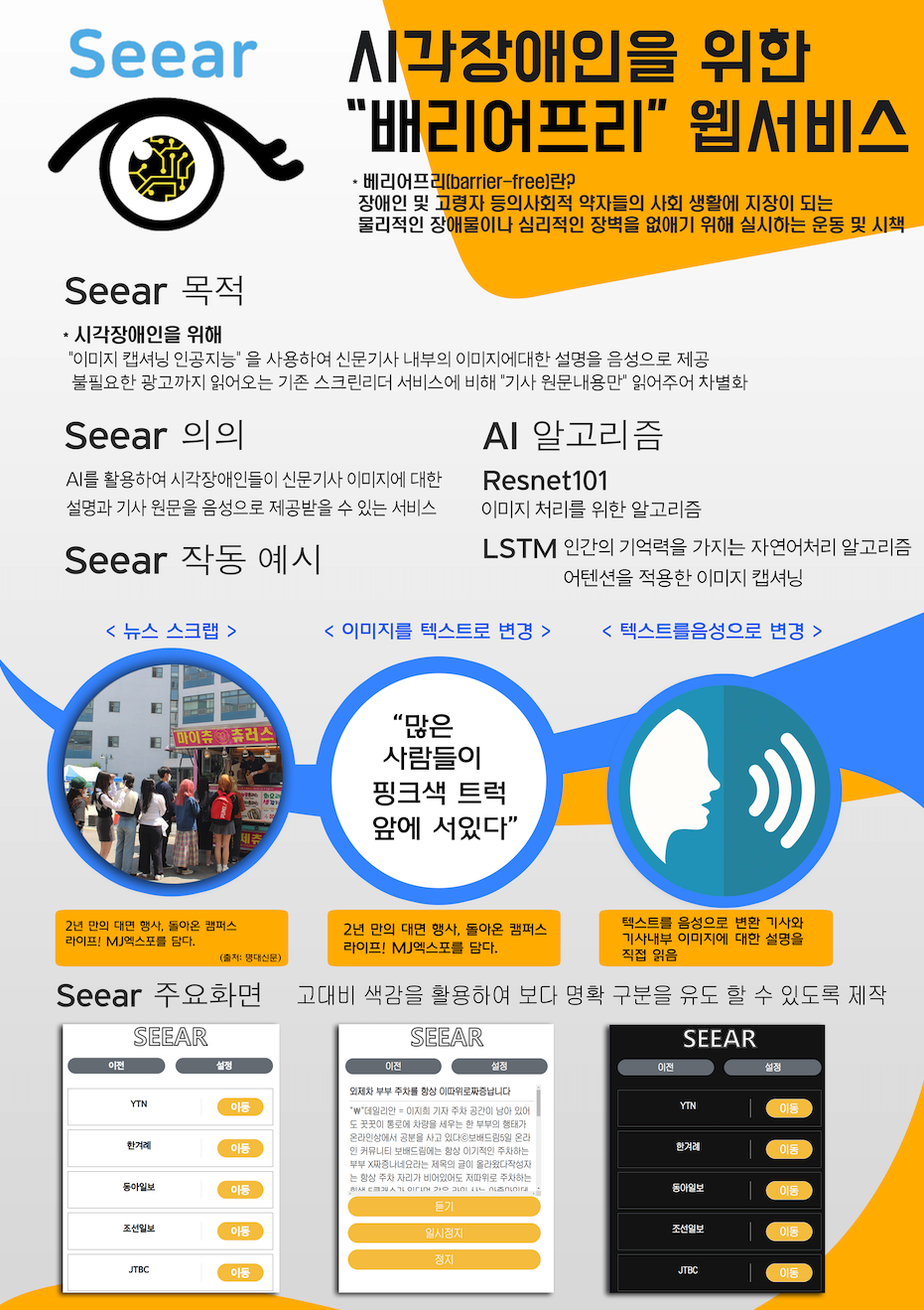 본 서비스는 배리어프리를 바탕으로한 사회공헌 서비스입니다. 대상은 시각장애를 갖고 있는 사람이며 시각적으로 처리하기 어려운 부분을 AI를 통해 청각적 요소로 변환하여 서비스를 제공하는 것이 핵심 목적입니다. 예를들어 HTML에서 제공하는 ALT속성은 사진을 설명하는 용도로 제공되고 있으나 사진의 세부 내용이 적혀있는 기사는 한정적입니다. 본 서비스는 이미지 자체를 직접 캡셔닝하여 읽어주며 어떠한 이미지라도 쉽게 접근할 수 있도록 합니다. 최종 목표은 시각적으로 얻을 수 있는 정보에 취약한 시각 또는 인지 장애인이 음성을 통해 비장애인과 동일한 수준의 정보를 습득하도록 하는 것입니다.
