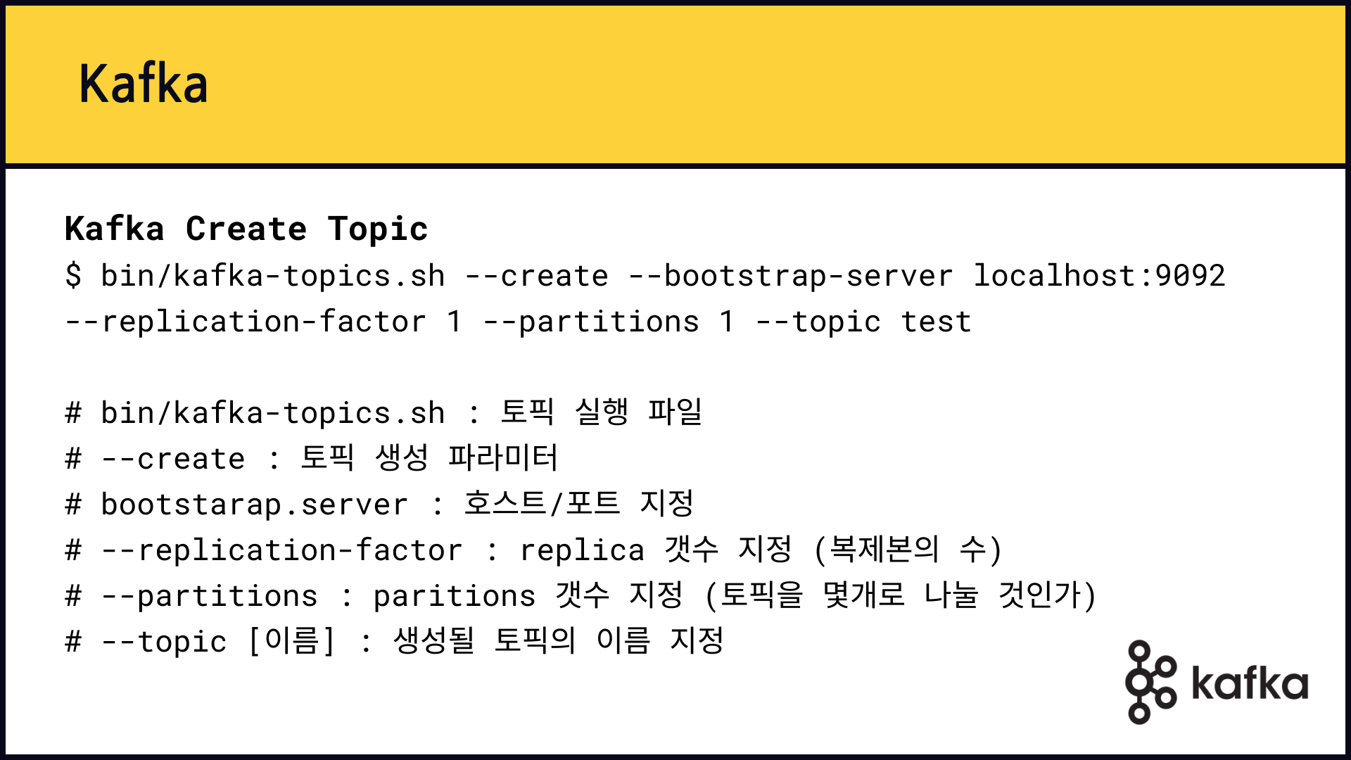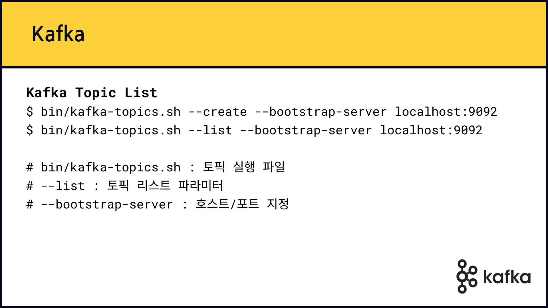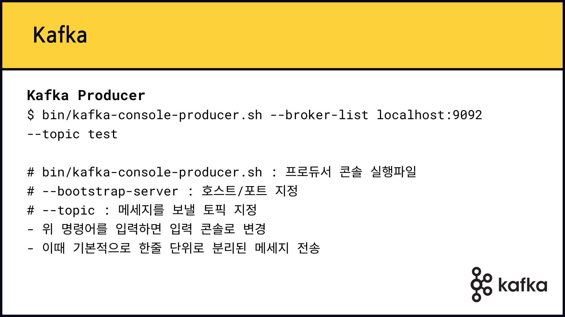 kafkaAdmin.setKafkaTopic("my-kafka-example") # Kafka 토픽 생성