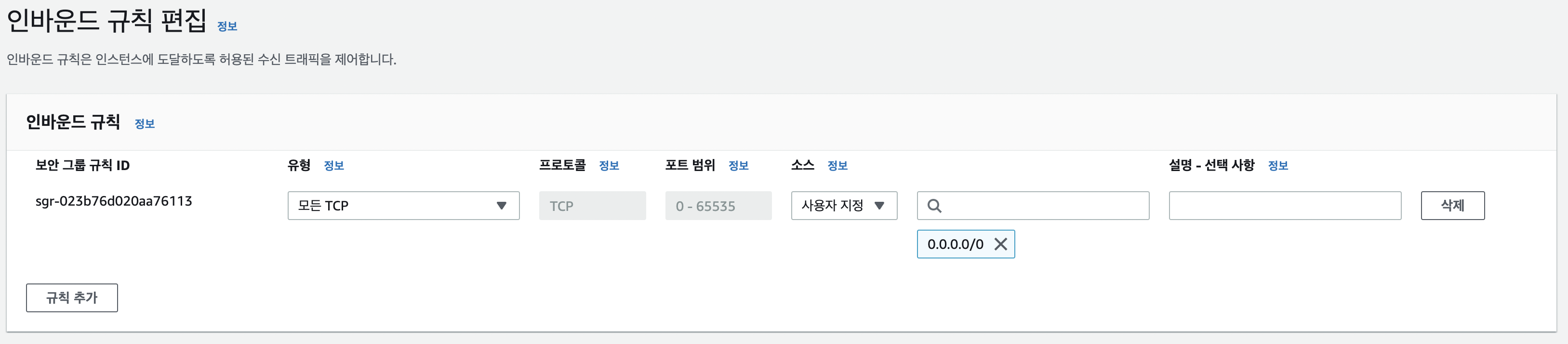 기본적으로 보안 설정에 맞게 세팅해야하지만 테스트를 위해 모든 보안포트를 오픈